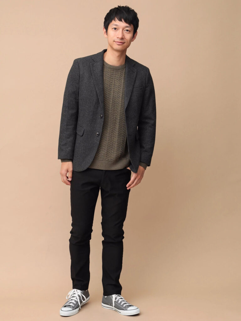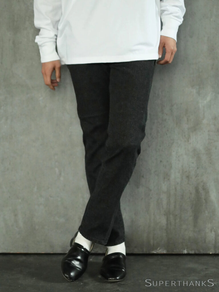 グレーよりさらに暗いブラックデニムは、きれいめにもカジュアルにも使えるオールラウンダーです。