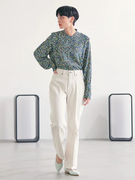 ホワイトデニムと花柄ブラウスの相性は抜群です。爽やかな雰囲気がさらに増し、パンツスタイルでも女性らしいコーデになります。