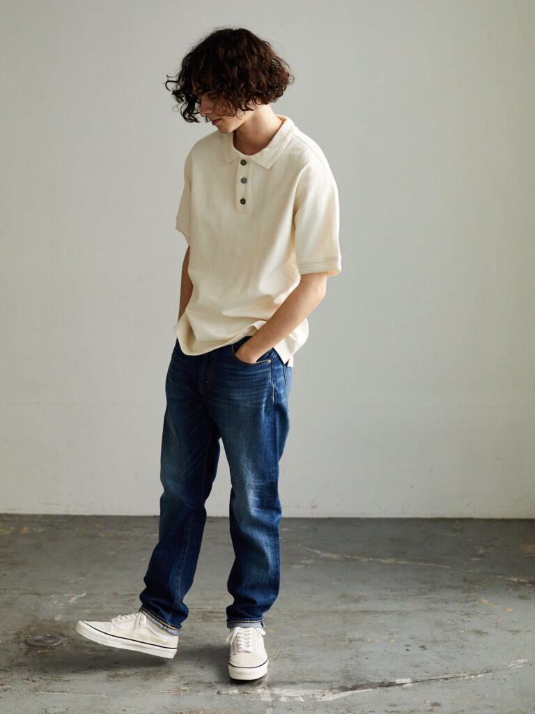 落ち着いた印象のインディゴデニムには、カジュアルなポロシャツがよく合います。