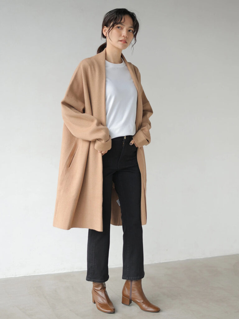 スッキリとしたブラックデニムなら、ボリュームのあるアウターもバランスよくまとまります。スタイリングにメリハリが出てスタイルアップ効果も期待できます。