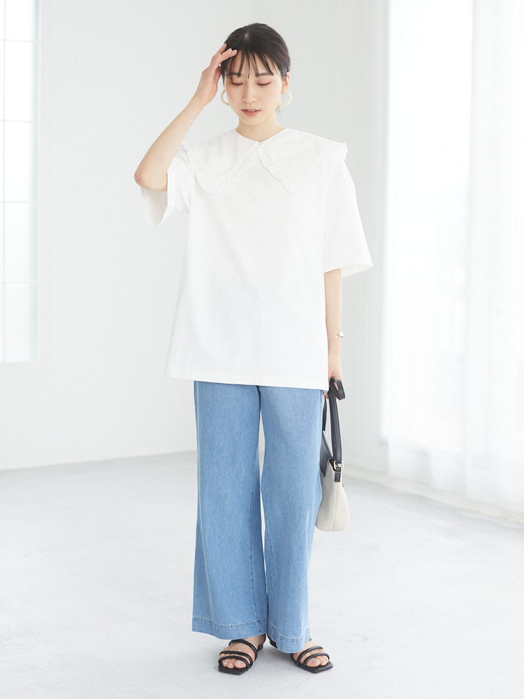 濃い色のトップスと合わせてコントラストを楽しんだり、あえて淡い色のトップスを重ねて爽やかさを強調したり、いろいろなコーデに合わせられる万能デニムです。