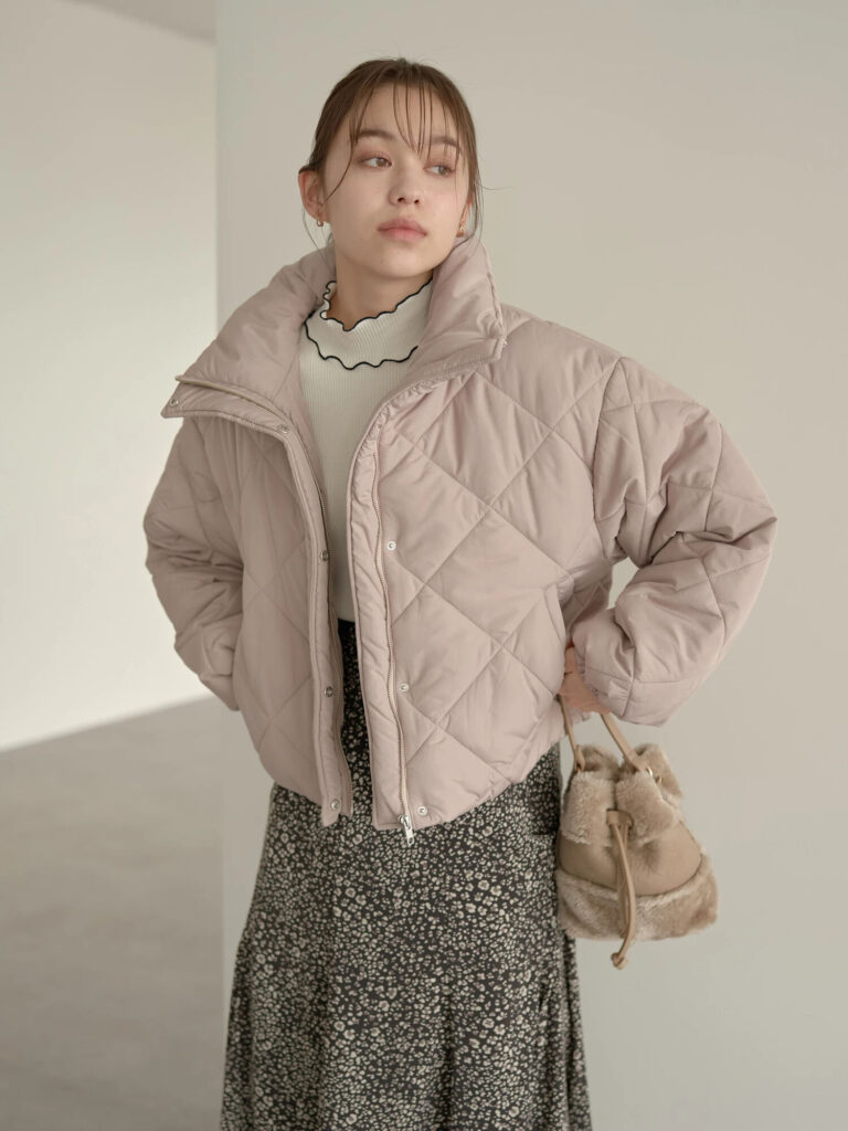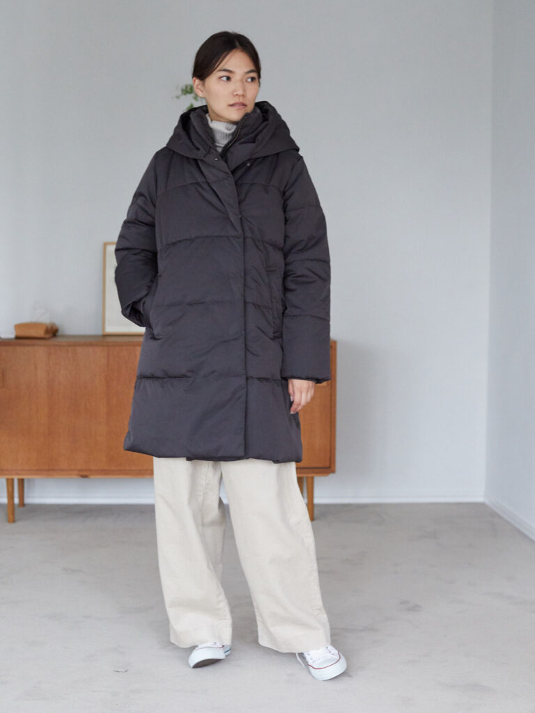 ふっくらとしたボリューム感が今っぽいエコダウン。マットな質感がカジュアルさを軽減し、ミニマルなデザインも相まってスタイリッシュで大人っぽい印象です。