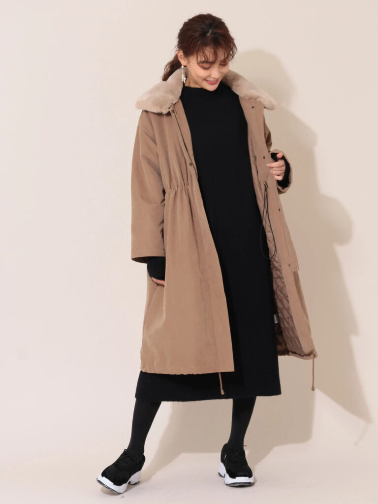 メンズライクなミリタリーコートも、ふわもこのエコファーの甘さで大人フェミニンに昇華。