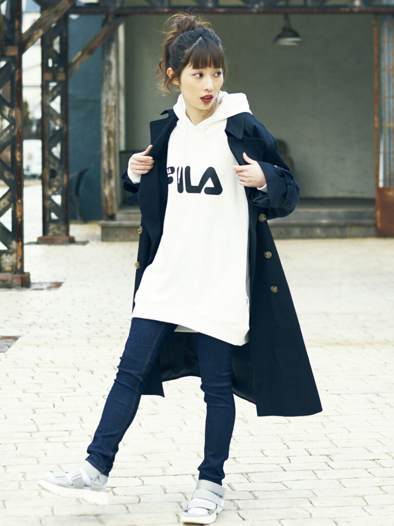 同じくルーズシルエットのフーディーとデニムを合わせて、メンズライクなカジュアルに。トラッドなトレンチの持つきちんと感が、カジュアルのなかにもクリーンな印象を添えてくれます。