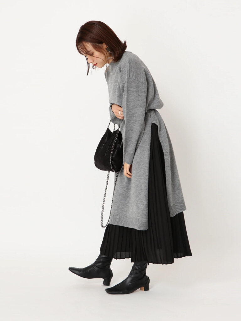 ボトムにはとろみのあるプリーツスカートで華やぎをプラス。グレー×黒の色味を抑えたカラーコーデでシックな大人っぽさをアピール。