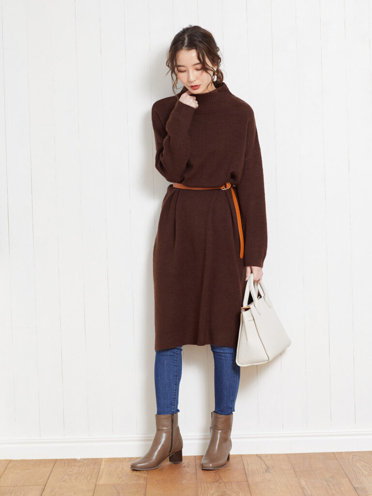 甘くなりがちなニットワンピも、モックネックのこなれ感とレイヤードスタイルでほどよく辛口に。細ベルトでウエストマークすれば、スタイルアップも叶います。足元はショートブーツで脚長効果を。