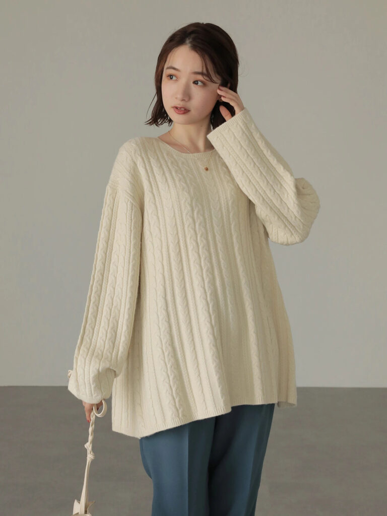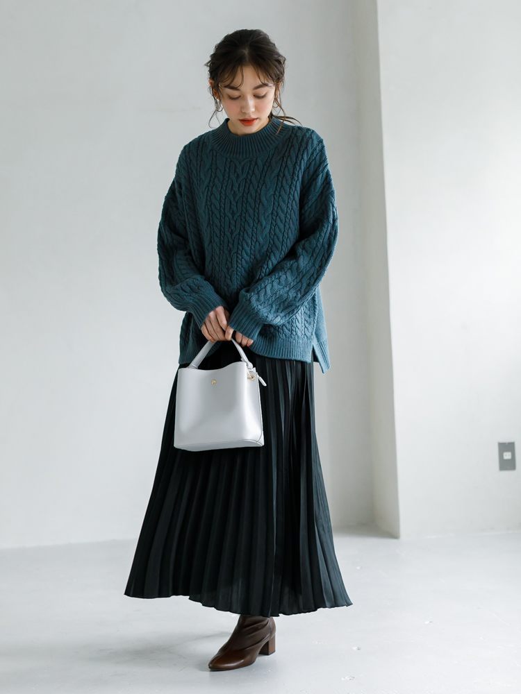 青みがかった深いグリーンで、大人の知性と落ち着きを演出。ルーズなシルエットとざっくりとしたケーブル編みが、リラックス感を纏わせます。