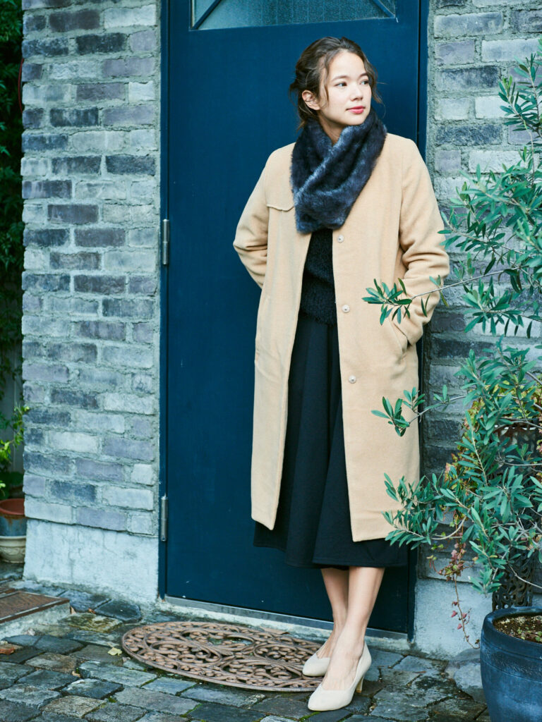 エレガントな佇まいのキャメルのアウターの中には、ブラックを仕込んで大人っぽく!ウールライクなフレアスカートが、正統派レディな着こなしを加速してくれます。