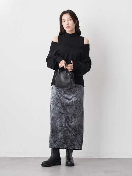 肩出しのニットと、上品な光沢のベロアスカートコーデ。ダークカラーでまとめつつ、素材違いのアイテムをMIXすることで上級者コーデに。