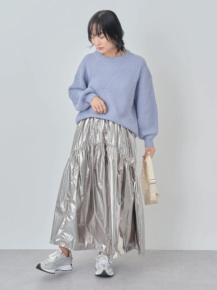 メタリックスカートをペールブルーのニットで!ひと癖あるリブ編で表情豊かなニットはコーデの主役になれるコーデです。