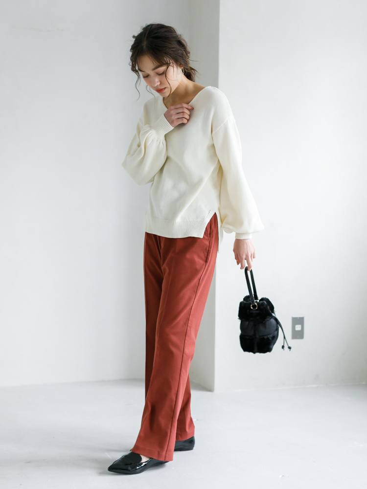 Vネックニットとパンツのシンプルなスタイルも、ディテールと色使いにこだわればモードな印象に。ニットのボリュームスリーブが、マニッシュな全体のコーデに可愛らしさを添えてくれます。