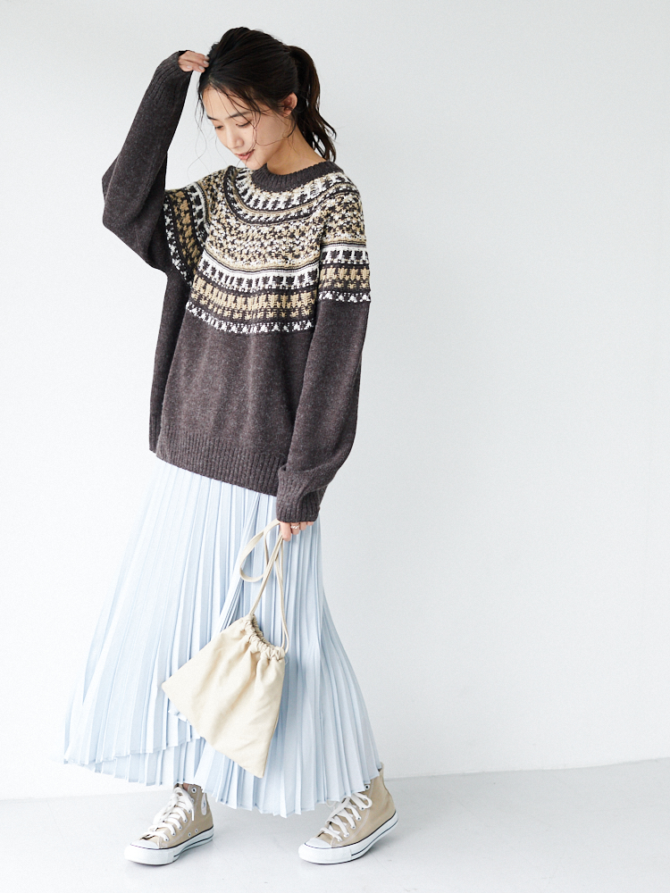 やわらかなブラウンには、アイシーなブルーのプリーツスカートを合わせて、ほっこりし過ぎない大人ナチュラルなスタイルを。