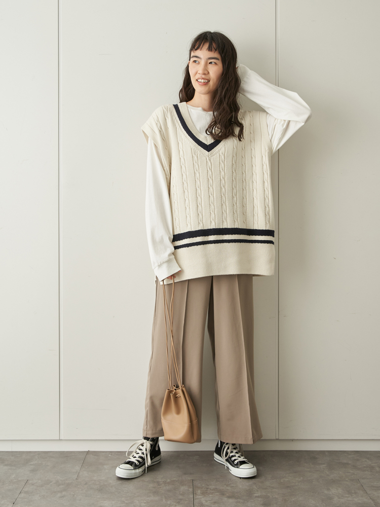 トラッドとスポーティーを一度に叶えてくれるチルデンニットのベスト。配色ラインとケーブル模様がメリハリのあるコーデを実現してくれるだけでなく、Vネックがシャープな顔周りを演出してくれます。
