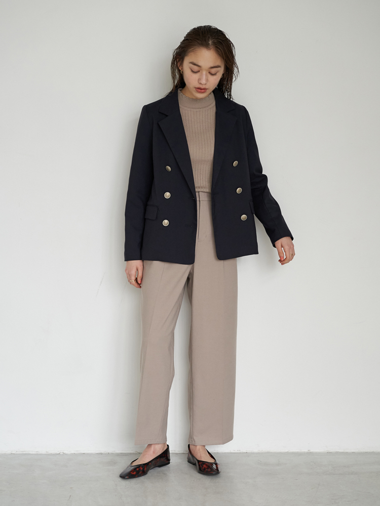 朝晩と昼の寒暖差の調節にはジャケットスタイルが便利です。トラッドなダブルボタンのジャケットをオーバーサイジングに仕立てて、こなれた印象に。