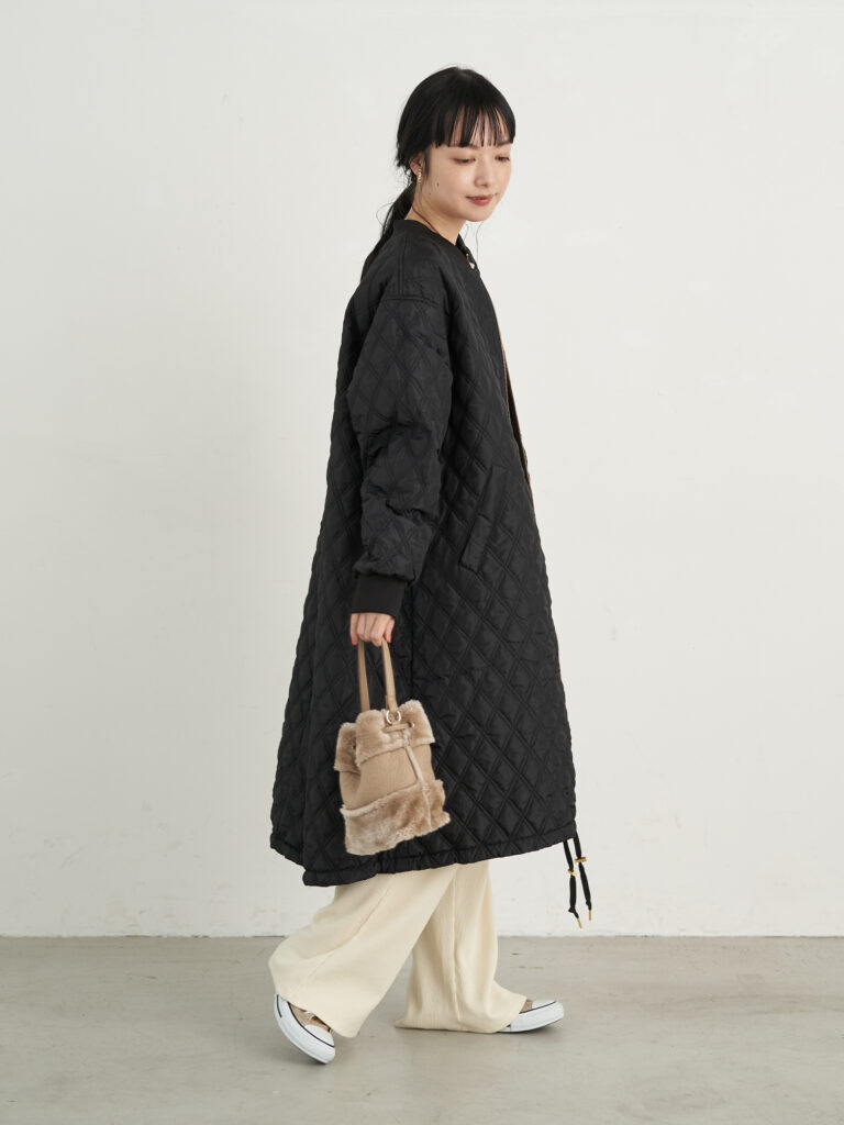 キルティングは今季の最旬アイテムの一つ。シックなブラックのキルティングジャケットは、羽織るだけでモード気分を高めてくれます。ロング丈がすっぽり身体を包み込み、防寒もばっちりです。