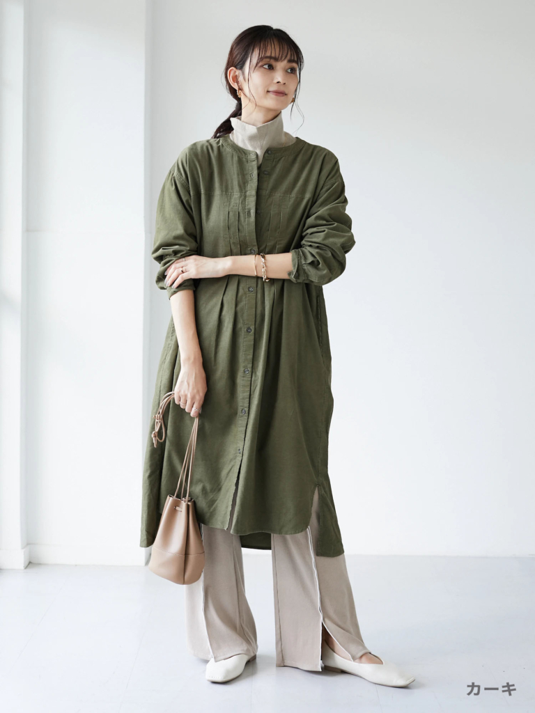 【ノーカラー細コール天ワンピース】