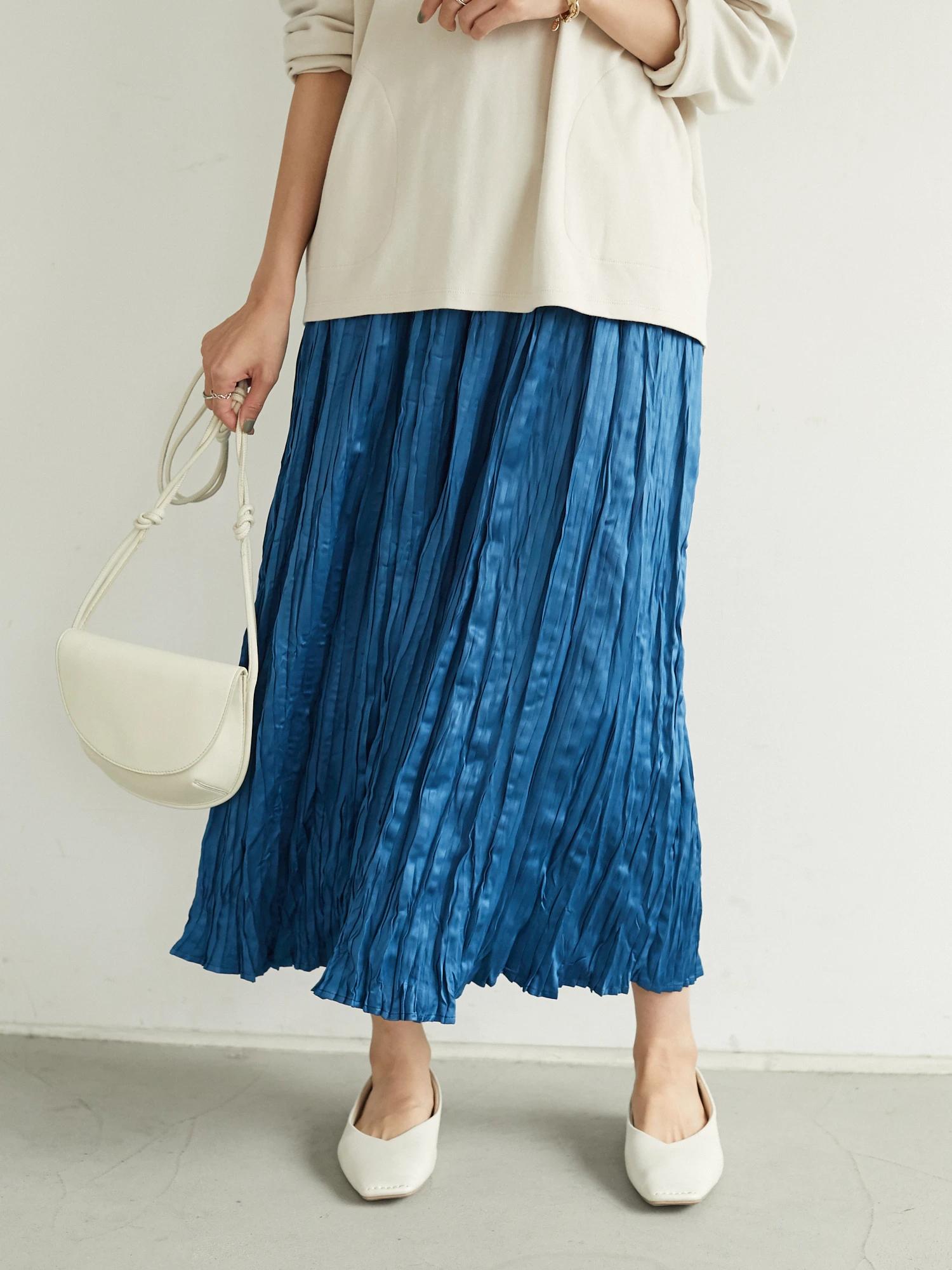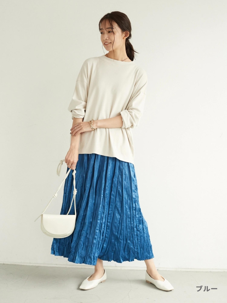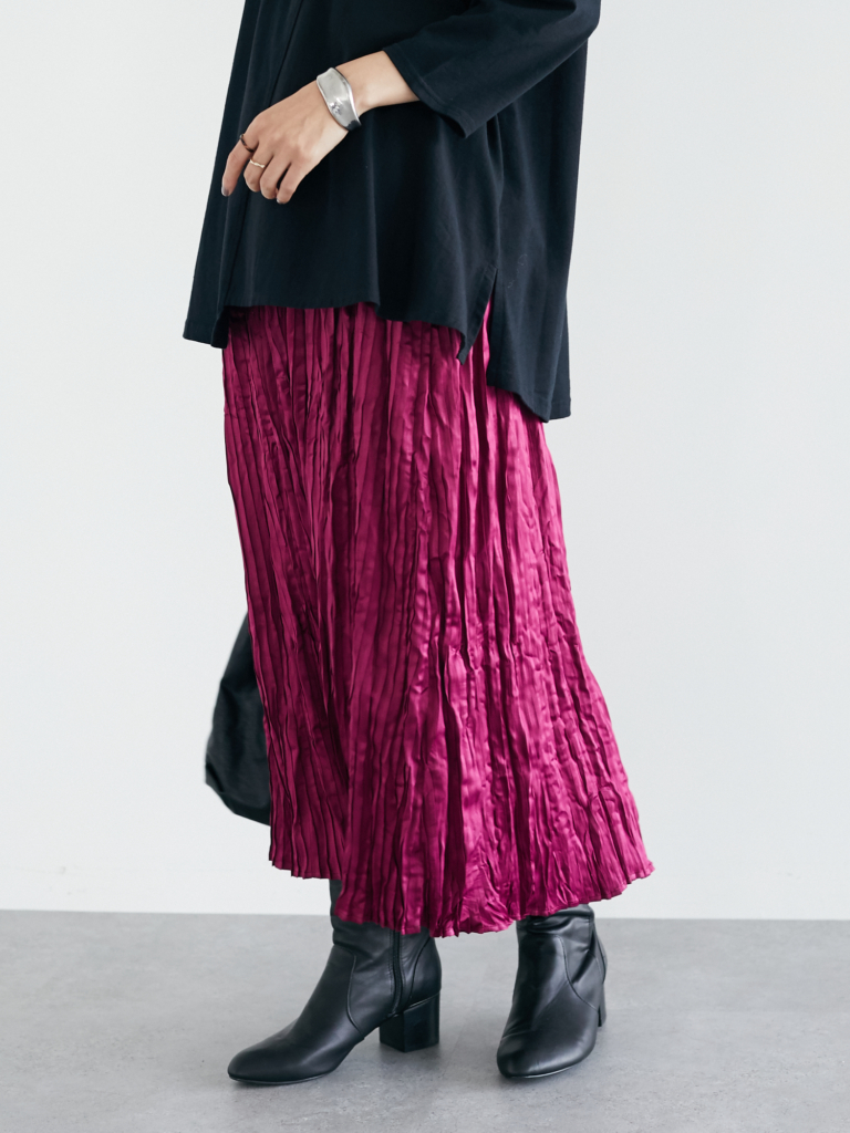 サテンの光沢と細やかなプリーツ加工がレディライクなスカート。