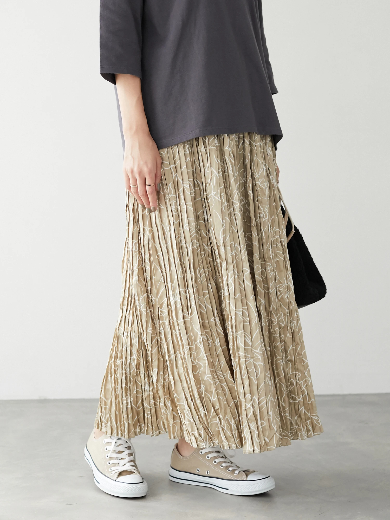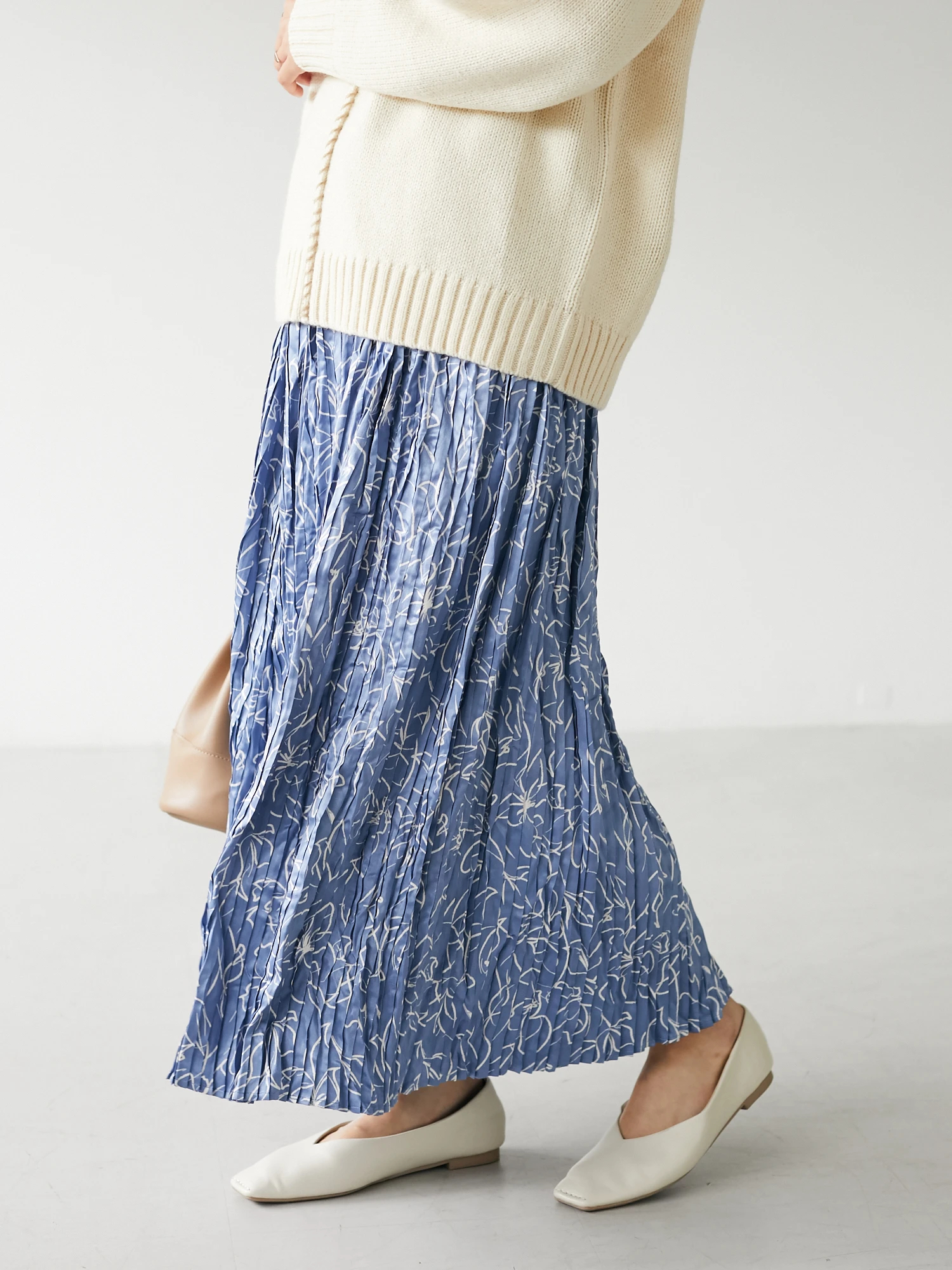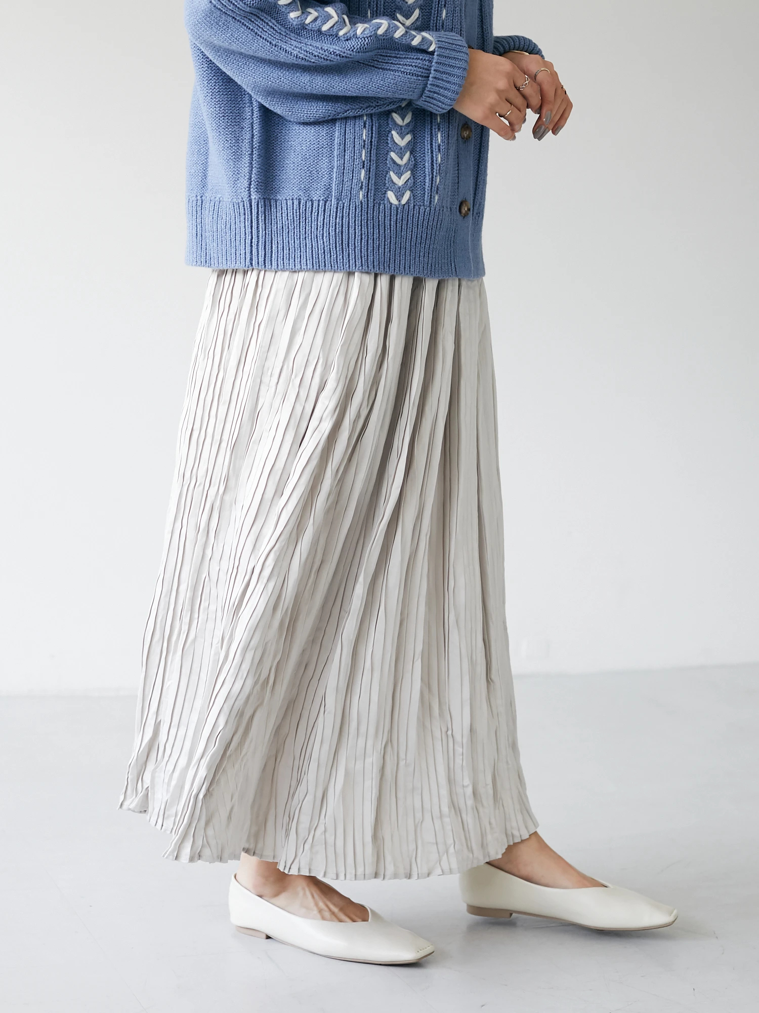 サテンの光沢と細やかなプリーツ加工がレディライクなスカート。