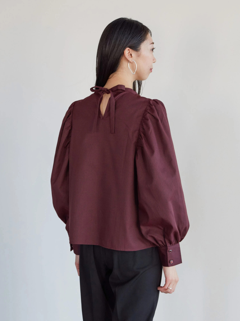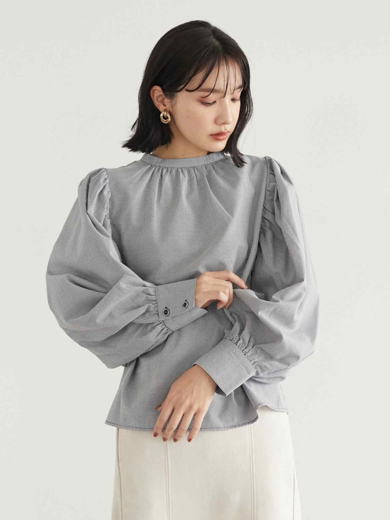 細かいギンガムチェックがフェミニンなブラウス。