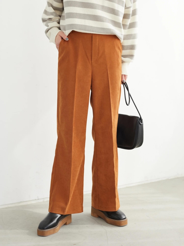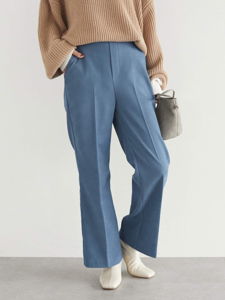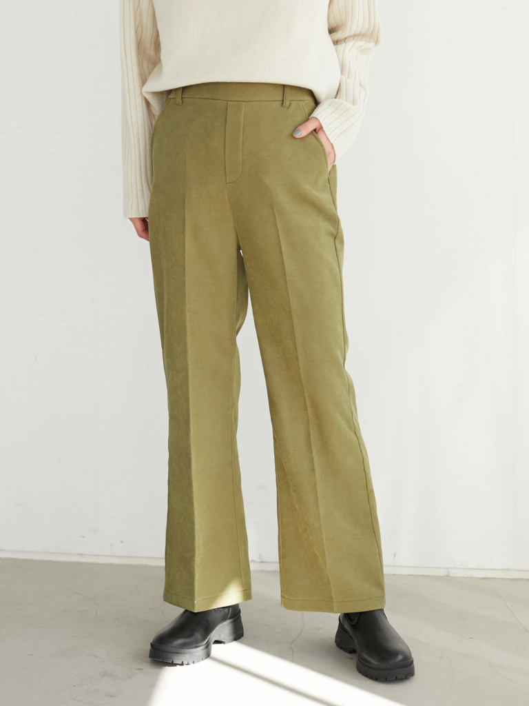 シーズンライクな起毛素材に、センタープレスが施されているフレアパンツです。