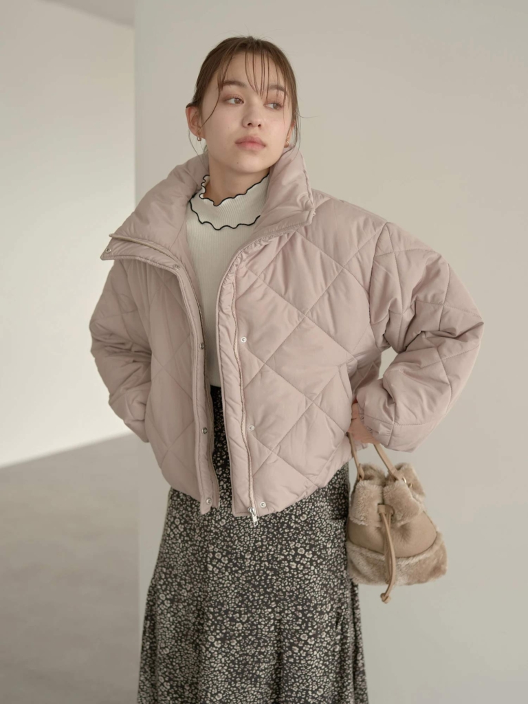 中綿入りで暖かいキルト生地のショート丈ブルゾン。