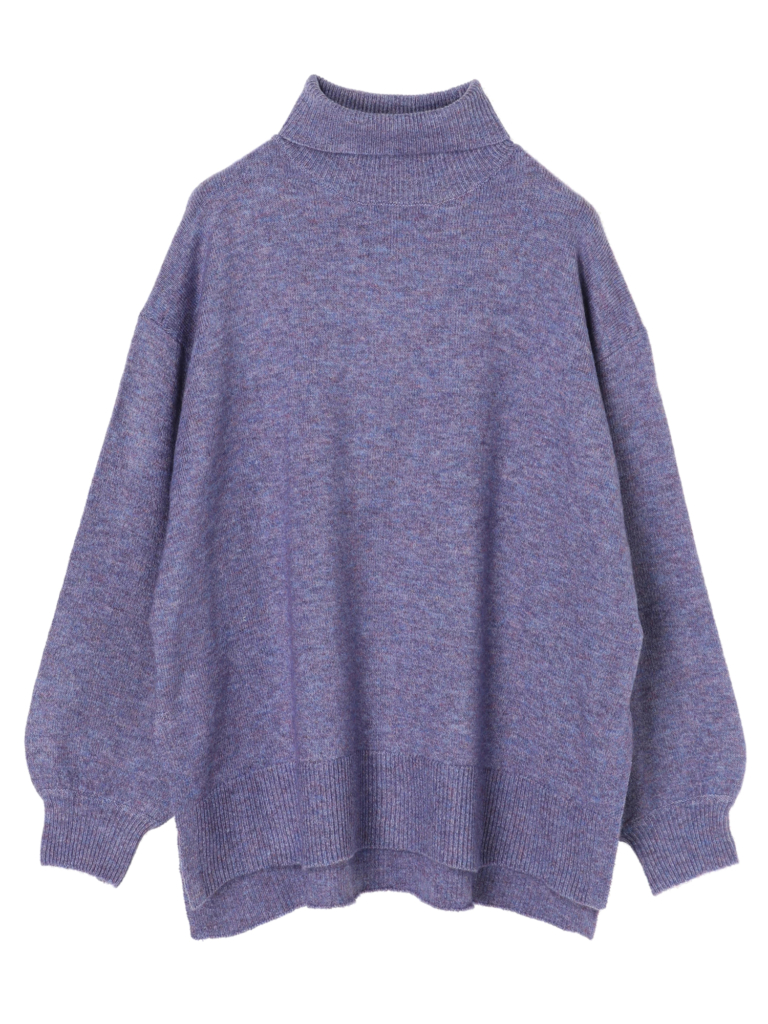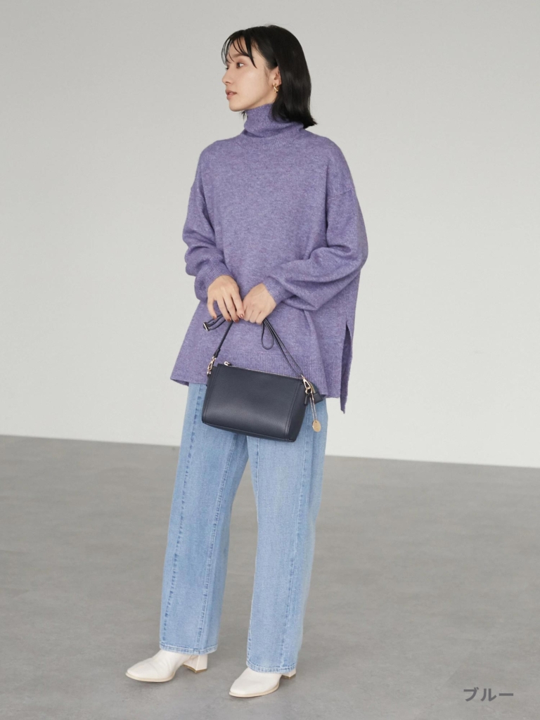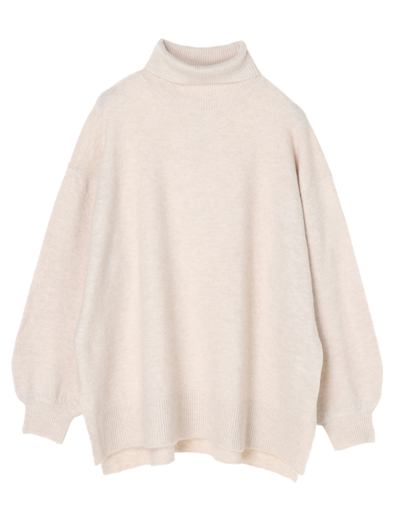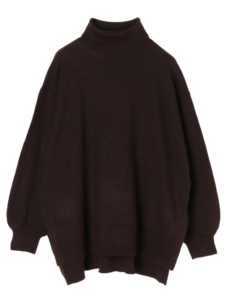首元まで温かく包み、小顔効果もあるハイネックデザインのニット。