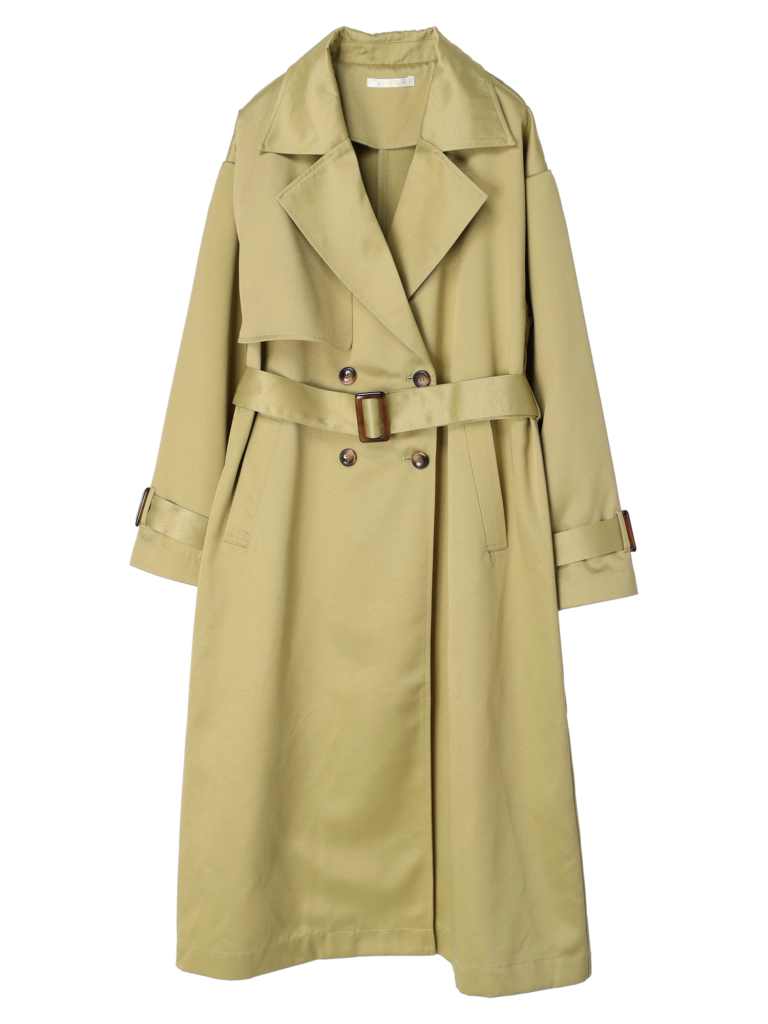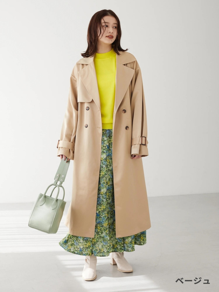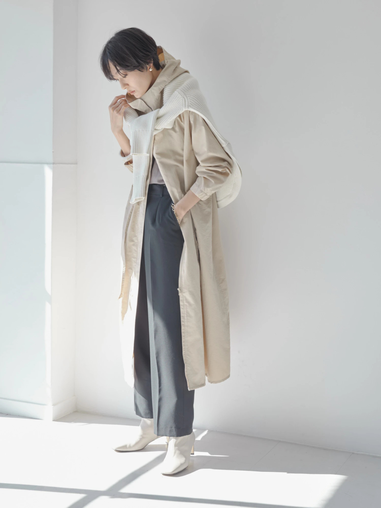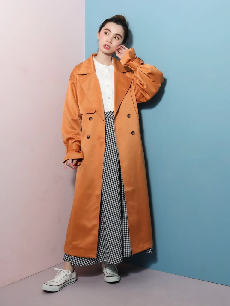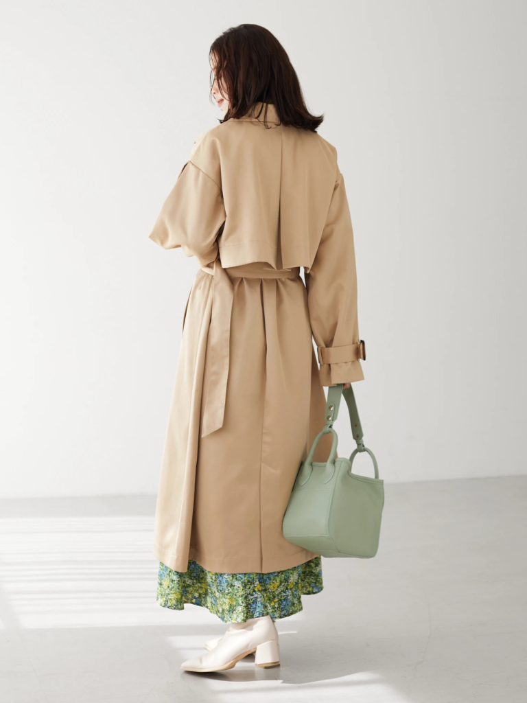 定番のトレンチコートにボリュームスリーブでトレンドを加えたデザイン。