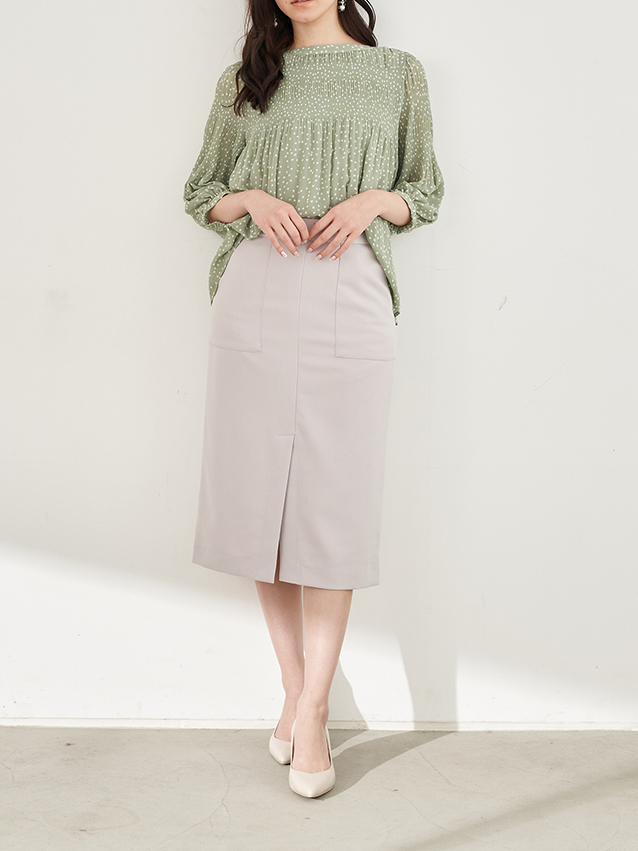 タックショルダーブラウス×柄スカートでフェミニンさを。ブラウスはラウンドネックなので、堅すぎず上品な抜け感が演出可能。オフィスカジュアルはもちろん、退社後のデイリーユースにも◎