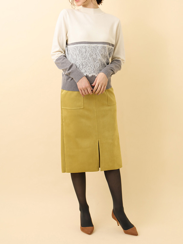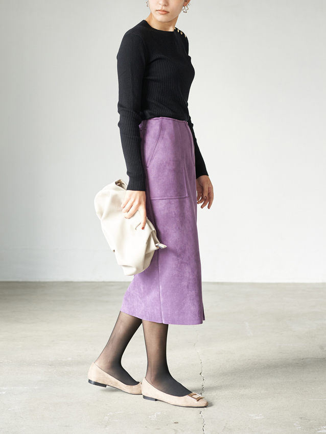 スエードスカート×タイトめシルエットが大人の上品さを醸し出す