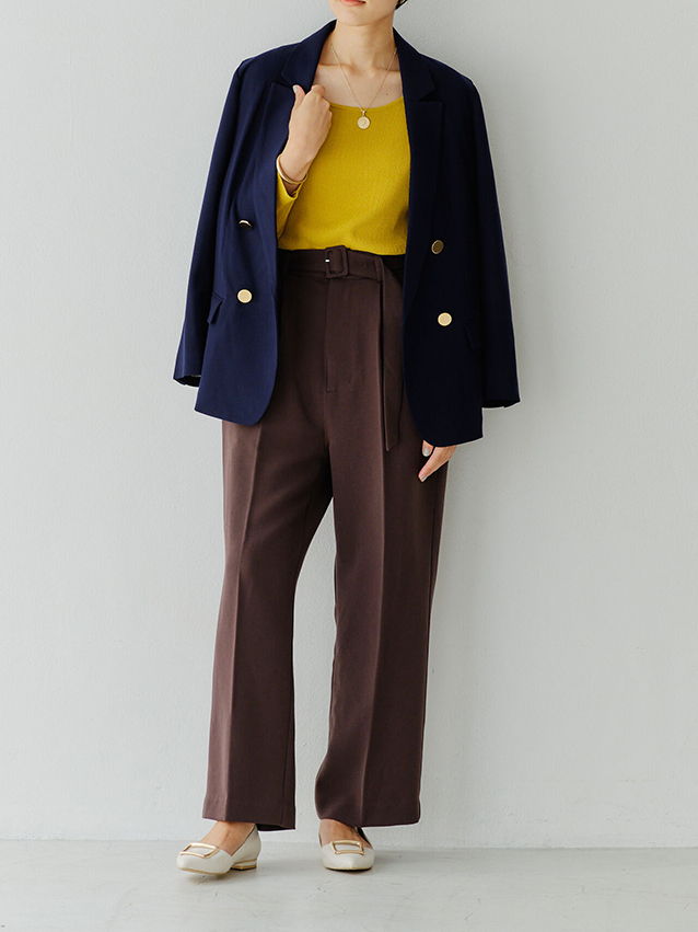 イージーパンツときれい色ニットでワンランク上の抜け感を