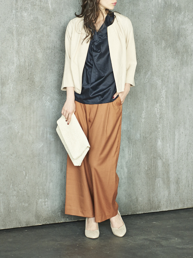シルエットの変化を楽しめる2ブラウスで、フェミニンな印象に。キャメル×アイボリーカラーの組み合わせで柔らかさも演出。レーヨンを使用しているので、着心地も抜群な快適コーデです。