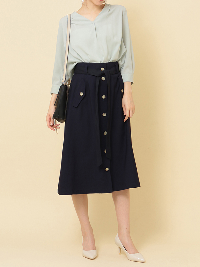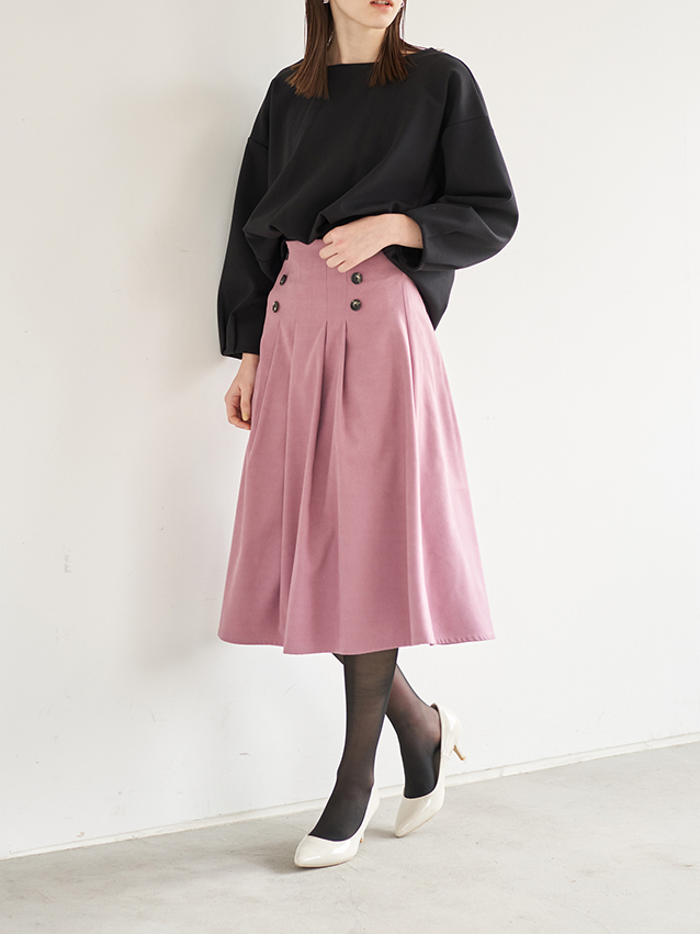 両サイドにボタンをあしらったクラシカルなデザインのスカートとボウタイブラウスで、エレガントな雰囲気に。スカートは軽いメルトン素材を使用。きれいに広がるフレアシルエットとトップスインの脚長効果でより上品に。