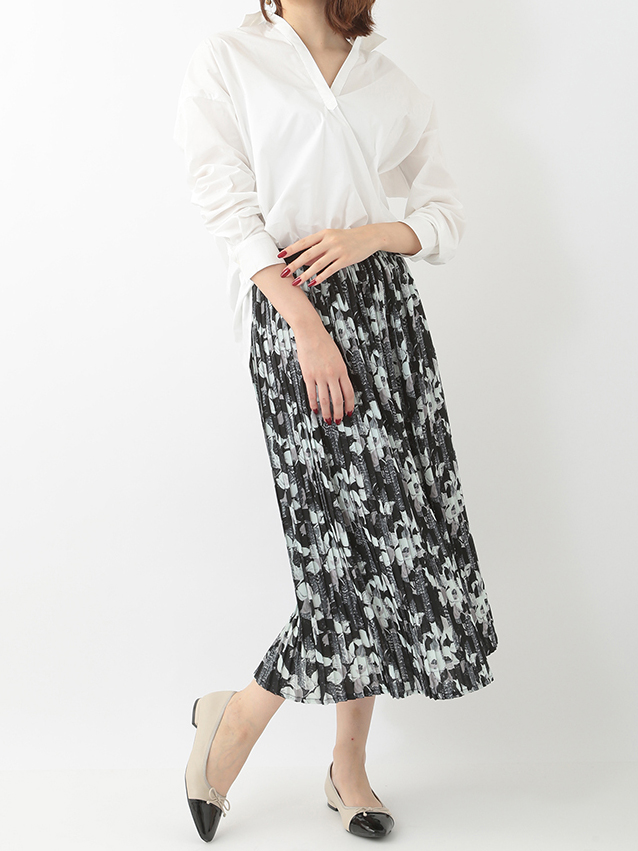 脚をきれいに見せるボタニカル柄のフレアスカートに、キーネックデザインのブラウスをウェストインし、フェミニンな上品さを引き立てるコーデ。スカートの長めレングスは、華やかさの中にも大人っぽさと落ち着きをプラス。
