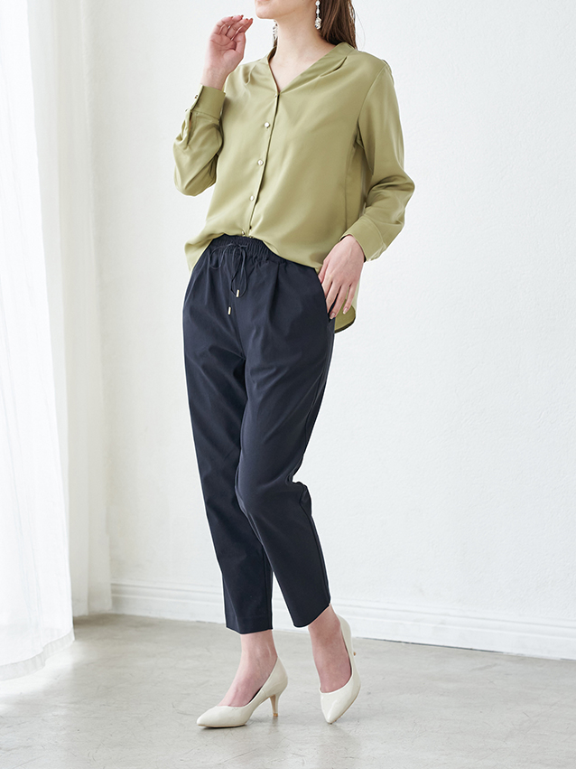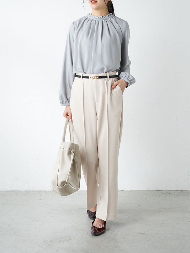 パウダーサテンが上品なギャザーブラウスに、ダークカラーのパンツを合わせて、ふんわりとしたシルエットの中にもメリハリをプラス。首元をすっきりと見せてくれるネックデザインのブラウスは、オフィスにもお出かけにも着回し力抜群。
