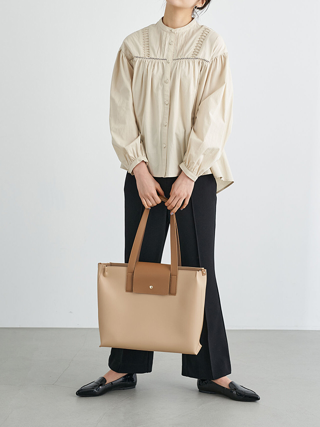 バッグは、シンプルなトートバッグが人気です。キャンバストートはカジュアル過ぎるため、レザー(フェイクレザー)などを選びましょう。また大きさは、書類やノートPCの入るA4サイズ対応が便利です。近年では、リュックでもきれいめのデザインであれば好まれています。
