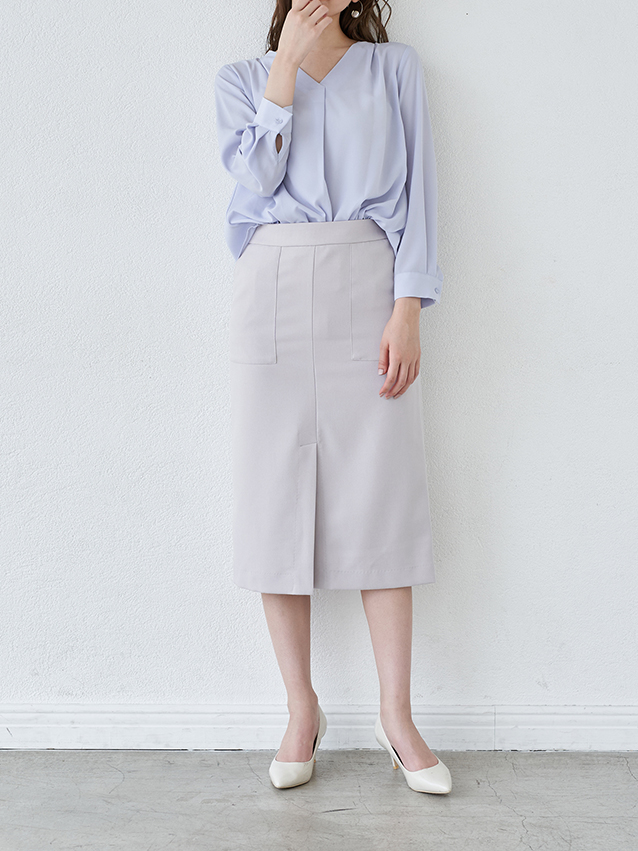 スタントカラーのブラウス×タイトスカートで知的なムードを演出