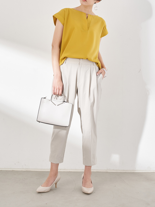 Vネックがコーデ全体を引き締め、スッキリとした印象に。明るいカラーとドロップショルダーが抜け感を演出。オフィスカジュアル以外にも、女子会やデートなどさまざまなシーン活躍するコーデ。