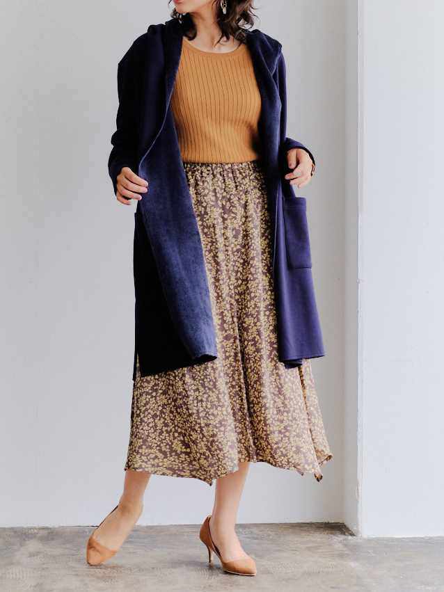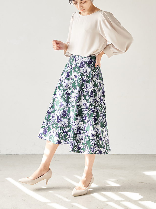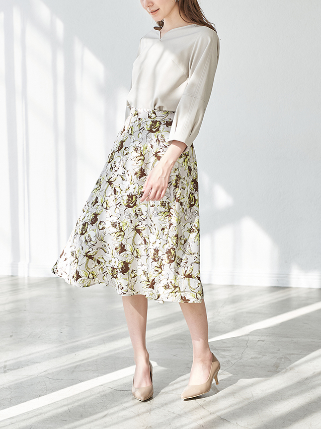 ボタニカル柄フレアスカートでフェミニンな上品さを
