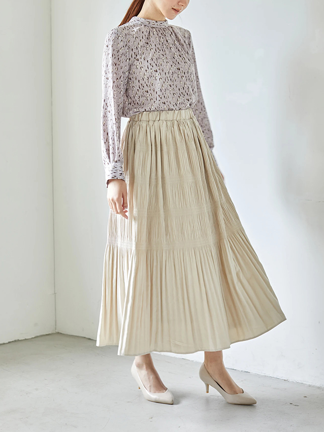 ネックのリボンがポイントのブラウスに、プリーツスカートを合わせたフェミニンな印象のコーデ。白とベージュのワントーンで、より女性らしい優しい雰囲気。2WAYデザインのブラウスは、レオパード風のジオメトリック柄がさりげないアクセントに。