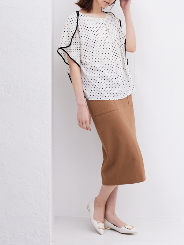 ドットブラウス×キャメルスカートで遊び心をプラス