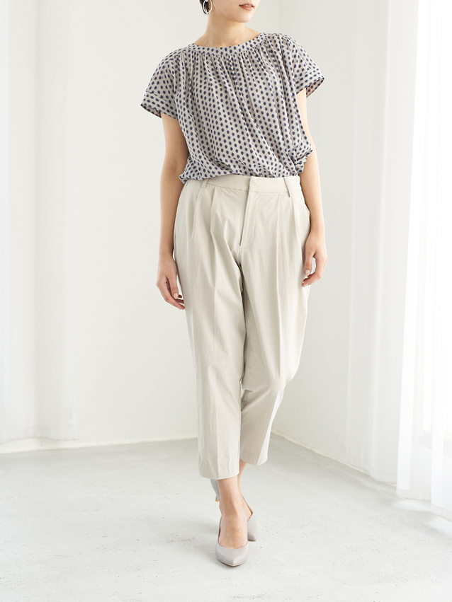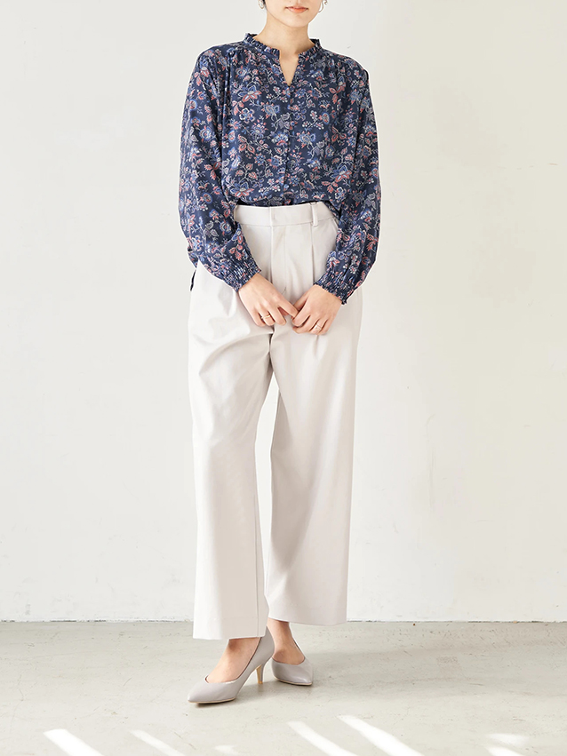 ふんわりとしたギャザーフォルムのブラウスを主役に、シルエットのきれいなタックパンツを合わせて大人の可愛さを演出。ブラウスのプロバンス柄でニュアンスを添え、周りと差のつく着こなしに。