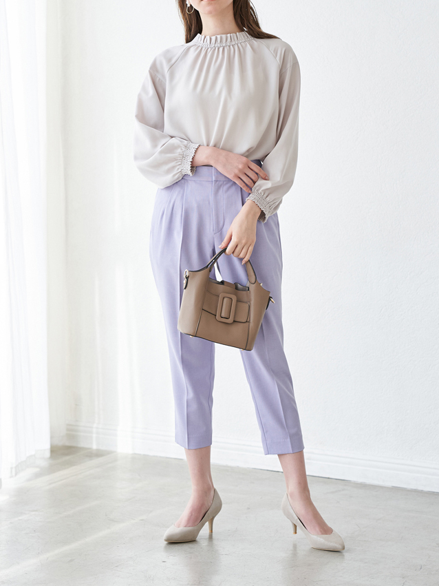 テーパードシルエットのタックパンツで上品な印象に。ラベンダーカラーをチョイスすることで、コーデのアクセントにも。足元もスッキリと見えるのでスタイル映えするコーデです。