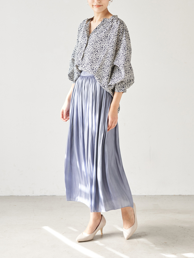 花柄プリントのボリューム袖ブラウスに、パステルカラーのプリーツスカートを合わせたフェミニンなコーデ。ブラウスのスキッパーネックが、甘すぎない大人のヘルシー感を演出。袖は内側のボタンで2WAYのシルエットが楽しめるのもポイント。