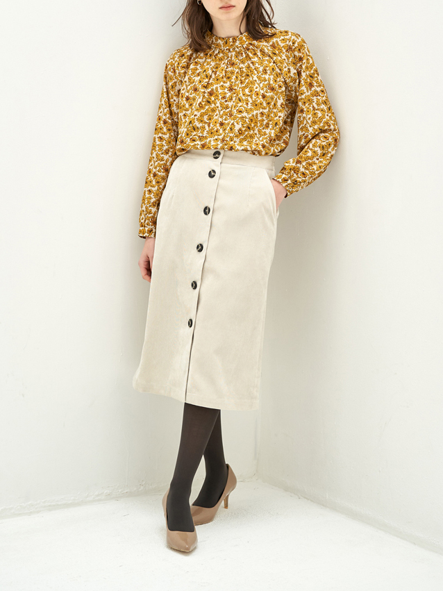 ボタンをあしらったタイトスカートにスタンドカラーのブラウスをインし、知的なムードを演出したコーデ。ブラウスの女性らしい花柄とフロントタックが華やかさを添え、エレガントな印象をアップ。