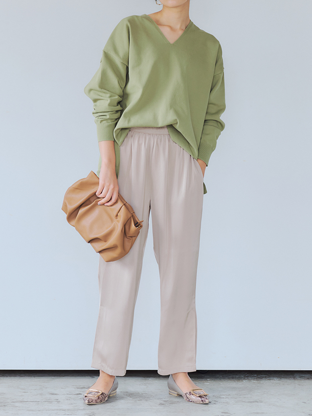 柔らかく光沢感のあるイージーパンツにライトグリーンのきれい色ニットを合わせ、上品な爽やかさを感じさせるコーデに。サイドスリットのあるパンツは、ワンランク上のこなれ感をプラス。
