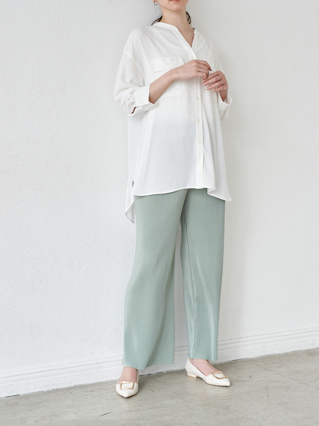 ミントグリーンのストレートパンツにゆったりシルエットの白シャツを合わせ、大人ならではの抜け感と爽やかさを感じさせるコーデ。細やかなプリーツ加工のパンツは、すっきりとしたシルエットと柔らかな揺れ感でフェミニンな表情に。