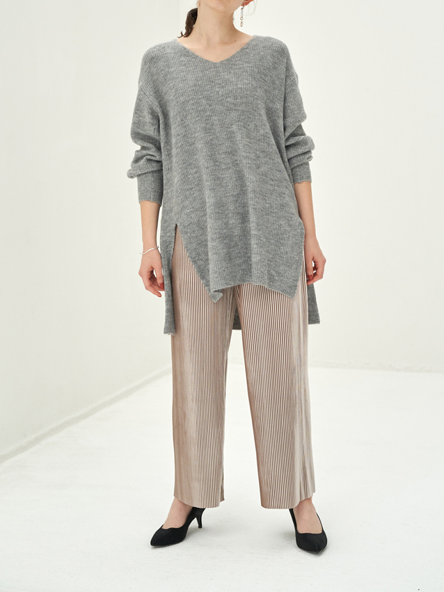 サイドスリット入りでゆったりシルエットがポイントのニットに、光沢感のあるプリーツパンツをプラス。デコルテを美しく見せるVネックがリラックスムードを漂わせ、柔らかな印象に。