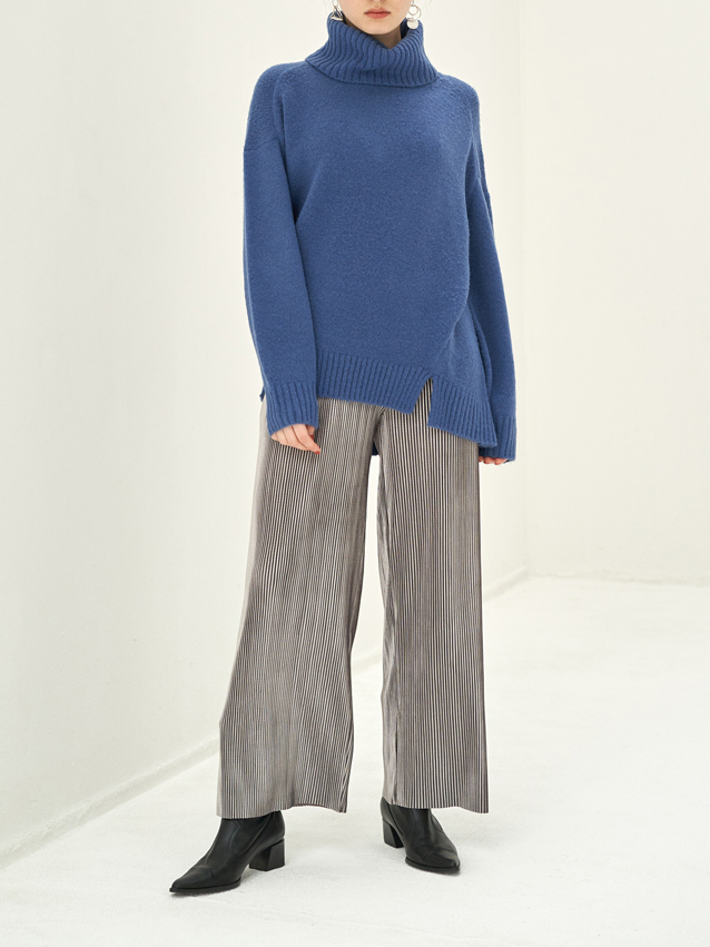 ふっくらとしたボリュームシルエットが大人可愛い、オフタートルニットが主役のコーデ。厚手のあたたかな風合いと長めの着丈で、寒い季節に大活躍。フレアなプリーツパンツをあわせてこなれ感を。