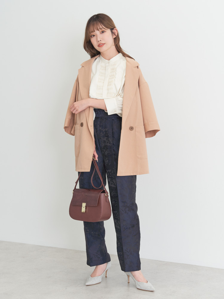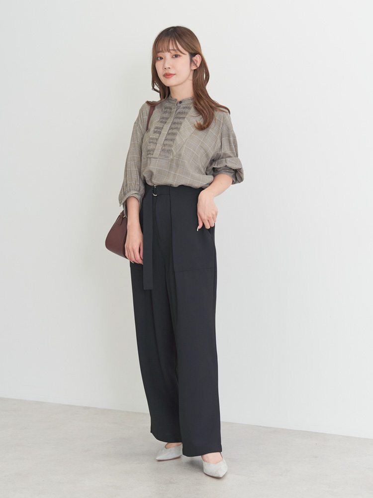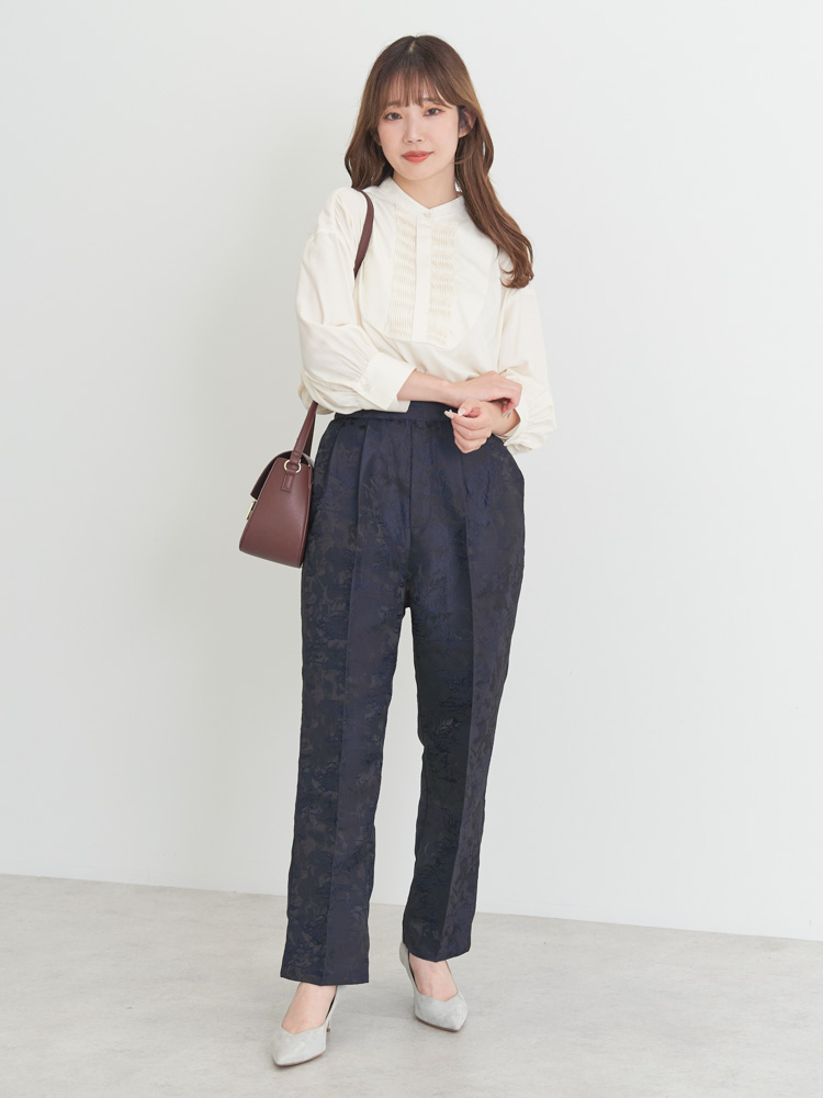 顔回りを華やかにしてくれるデザインブラウスをプラスしてコーデを一新!