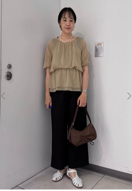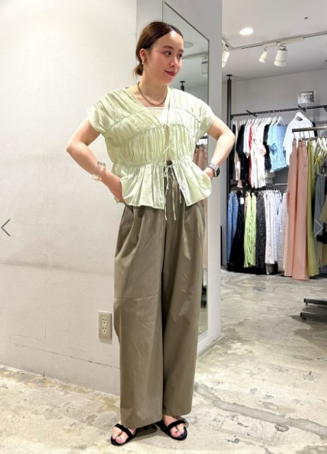 ギャザー&リボンディテールが、装いをさりげなくフェミニンな雰囲気に◎